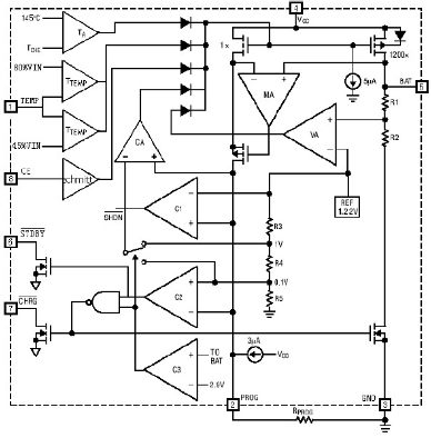 由于采用了內部PMOSFET架構,加上防倒充電路,所以不需要外部隔離二極管。熱反饋可對充電電流進行自動調節,以便在大功率操作或高環境溫度條件下對芯片溫度加以限制。充電電壓固定于 4.2V,而充電電流可通過一個電阻器進行外部設置。當充電電流在達到最終浮充電壓之后降至設定值 1/10 時,TC4056A 將自動終止充循環。內部框架圖如下所示