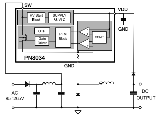 PN8034內置高壓啟動模塊,能夠實現系統(tǒng)快速啟動和超低待機功耗,待機功耗低于100mW。