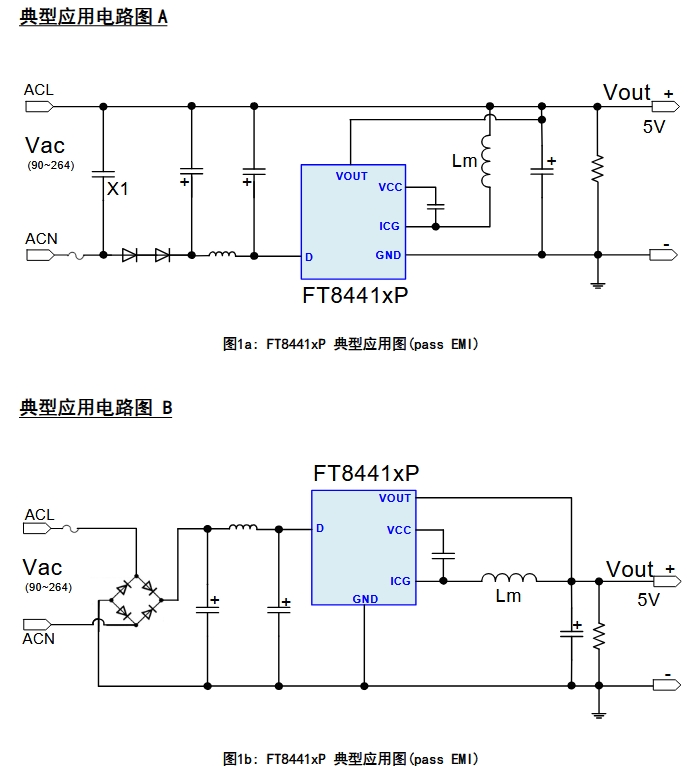 FT8441TP 的典型應(yīng)用電路圖展示了其在實(shí)際應(yīng)用中的簡(jiǎn)潔性和高效性。圖 1a 和圖 1b 分別展示了兩種典型的應(yīng)用場(chǎng)景,均能夠通過簡(jiǎn)單的電路設(shè)計(jì)實(shí)現(xiàn)穩(wěn)定的 5V 輸出。在這些電路中,F(xiàn)T8441TP 的各個(gè)管腳連接明確,輸入端接入 90-264V 的交流電壓,經(jīng)過內(nèi)部的處理后,在輸出端得到所需的直流電壓。通過合理選擇外部元件,如功率電感等,可以進(jìn)一步優(yōu)化電路的性能,確保其在不同負(fù)載條件下的穩(wěn)定運(yùn)行。這種簡(jiǎn)潔而高效的電路設(shè)計(jì),使得 FT8441TP 能夠輕松應(yīng)用于各種需要穩(wěn)定電源的小家電輔助電源、智能家居設(shè)備以及替代傳統(tǒng)線性電源和 RCC 電源的場(chǎng)合。