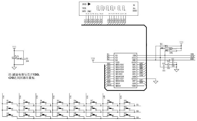 MCU數(shù)字接口:包括CLK(時鐘輸入)、DIO(數(shù)據(jù)輸入/輸出)、STB(片選)等引腳,用于與微控制器進(jìn)行通信。