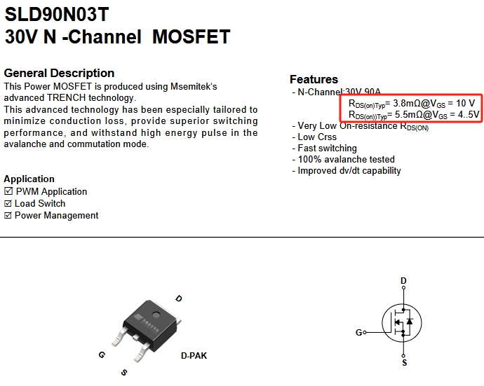 SLD90N03T:基于先進(jìn)溝槽技術(shù)(Trench),優(yōu)化了柵極電荷(Qg)和開(kāi)關(guān)速度,適合高頻PWM應(yīng)用。