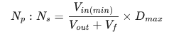 例如:90Vac輸入,12V輸出,肖特基壓降0.5V,最大占空比0.45,則匝比≈8:1。