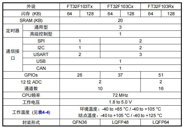 FT32F103系列基于ARM Cortex-M3內核,工作頻率高達72MHz,支持1.8V至5.0V的工作電壓,并能在-40至105°C的溫度范圍內穩定工作。該系列提供多種存儲容量和外設配置,以適應不同的應用需求。