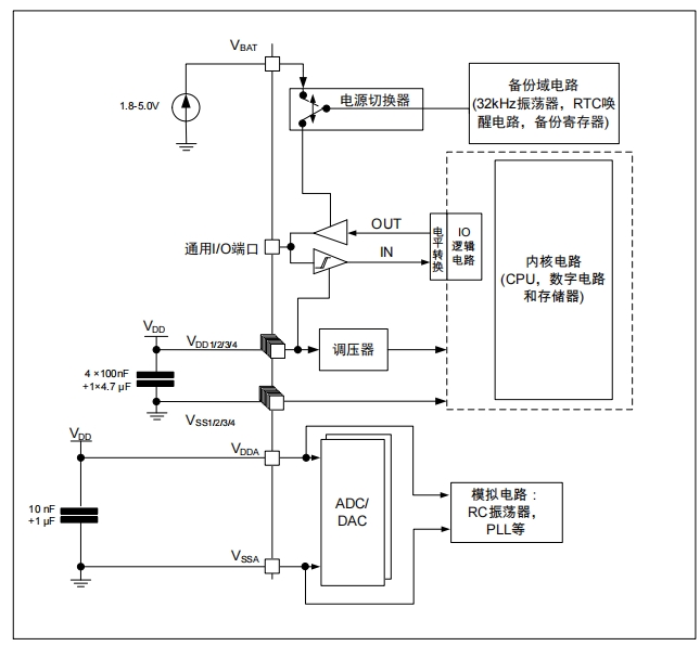 供電方案圖展示了電源引腳的連接方式,包括VDD、VSS、VDDA等,以及它們的電壓范圍和電流消耗。
