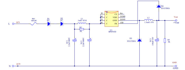 在智能家居、小家電、MCU待機(jī)供電等超小功率場(chǎng)景中,非隔離輔助電源因成本低、體積小、設(shè)計(jì)簡單而備受青睞。過去,OB2222E曾是這類100mA級(jí)方案的主流選擇,但受限于交期、價(jià)格及EMI裕量,工程師急需一顆直接替換、性能更優(yōu)的新品。BP8593D以 SOP7封裝、內(nèi)置700V MOS、PSR架構(gòu)、<100mW待機(jī)功耗為核心賣點(diǎn),官方參考設(shè)計(jì)5V/100mA已完整驗(yàn)證,BOM、PCB、測(cè)試數(shù)據(jù)一步到位,可實(shí)現(xiàn)零調(diào)試替代OB2222E。本文帶你一圖看懂這顆“小鋼炮”。