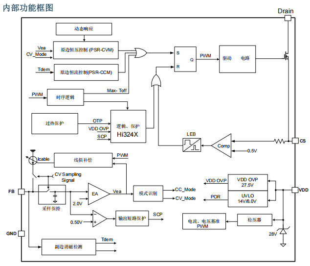 恒流:檢測CS腳+消磁時間Tdem,原邊算法把Tdem/Tsw鎖定在4/7,省掉光耦、431、次級電流檢測電阻。