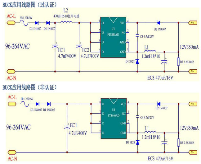 FT8440AD 支持 Buck 與 Buck-Boost 雙拓?fù)洌惶?BOM 只需改 2 個(gè)器件即可切換,方便一張 PCB 兼容 110 V 與 220 V 市場。