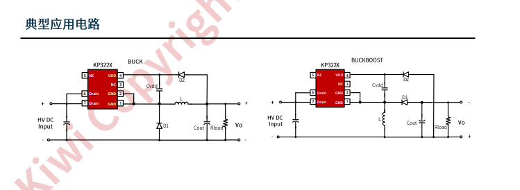 KP321X 集成有完備的帶自恢復(fù)功能的保護功能: VDD 欠壓保護、逐周期電流限制、輸出過壓保護、過熱保護、過載保護和 VDD 過壓保護等。
