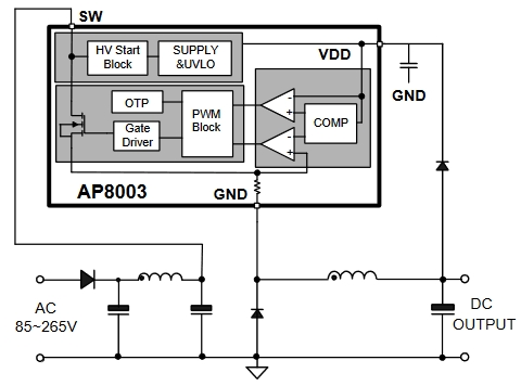 AP8003ZAC-T1集成PFM控制器及500V高可靠性MOSFET,用于外圍元器件極精簡的小功率非隔離開關(guān)電源。AP8003內(nèi)置500V高壓啟動,實(shí)現(xiàn)系統(tǒng)快速啟動、超低待機(jī)功能。該芯片提供了完整的智能化保護(hù)功能,包括過載保護(hù),欠壓保護(hù),過溫保護(hù)。另外AP8003具有優(yōu)異的EMI特性: