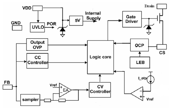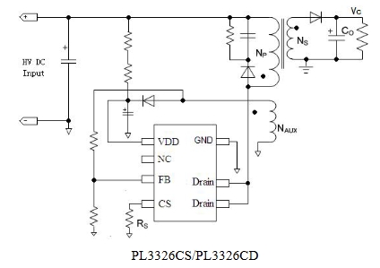 PL3326CS 是一系列高效率、高集成度、原邊調(diào)節(jié)的 PWM功率開關(guān),其主要應(yīng)用于小于 15W 的 AC/DC 反激式開關(guān)電源。PL3326C 通過去除光耦以及次級(jí)控制電路,簡化了充電器/適配器等傳統(tǒng)的恒流/恒壓的設(shè)計(jì),從而實(shí)現(xiàn)高精度的電壓和電流調(diào)節(jié),內(nèi)部框架圖如下所示