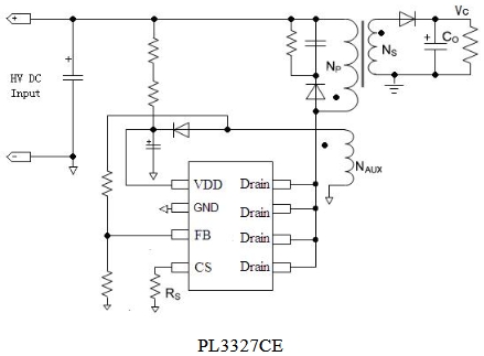 PL3327CE 是一系列高效率、高集成度、原邊調節的 PWM功率開關,其主要應用于小于 18W 的 AC/DC 反激式開關電源。PL3327C 通過去除光耦以及次級控制電路,簡化了充電器/適配器等傳統的恒流/恒壓的設計,從而實現高精度的電壓和電流調節,復合模式的應用使得芯片能夠實現低靜態功耗、低音頻噪音、高效率。而且高集成的功率 MOSFET 能夠降低外部 PCB的面積以及系統的成本。PL3327C 同時具有多種保護功能:逐周期峰值電流檢測、欠壓保護、過壓保護等。