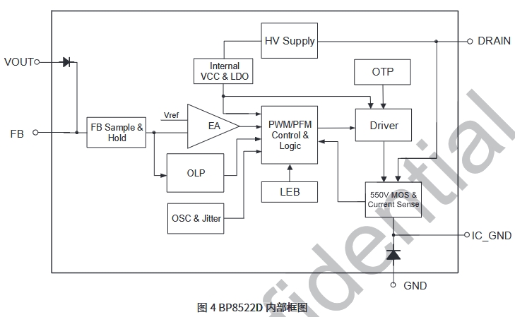 BP8522D內部集成了550V高壓MOSFET、高壓啟動和自供電電路、電流采樣電路、電壓反饋電路以及續流二極管,采用先進的控制技術,無需外部VCC電容和環路補償即可實現優異的恒壓輸出特性,極大地減少了外圍器件數量,節省了系統成本和體積,同時提高了可靠性。